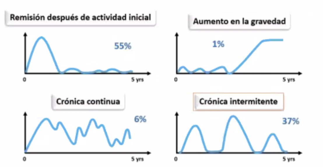 -remision despues de actividad inicial (se dx cuando esta en su peak y mejora con el tx)