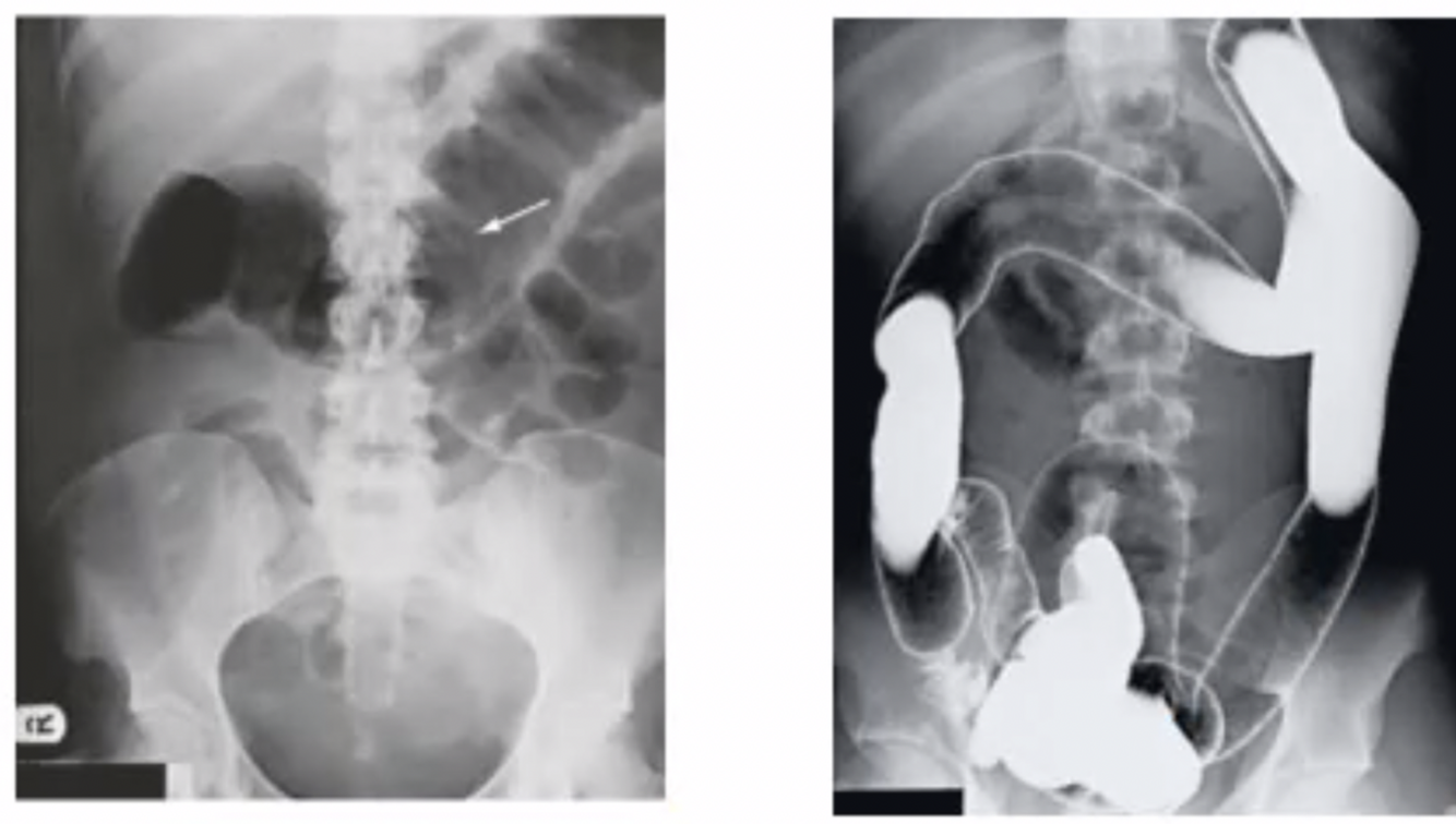 -TC con contraste (engrosamiento del colon, perdida de haustras)