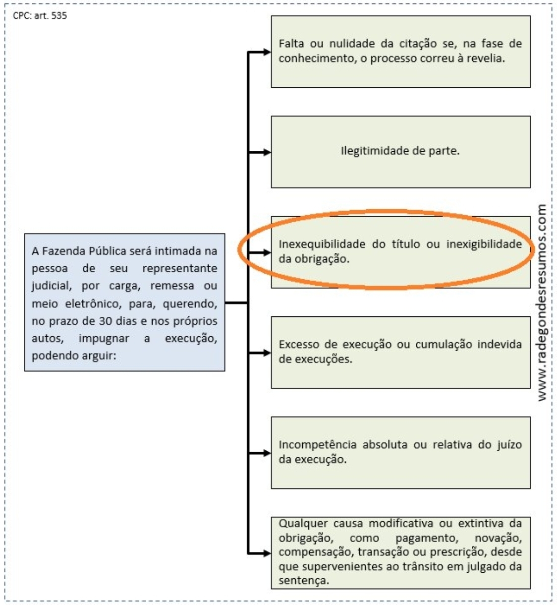🌳 Art. 535. A Fazenda Pública será intimada na pessoa de seu representante judicial, por carga, remessa ou meio eletrônico, para, querendo, no prazo de 30 (trinta) dias e nos próprios autos, impugnar a execução, podendo arguir: