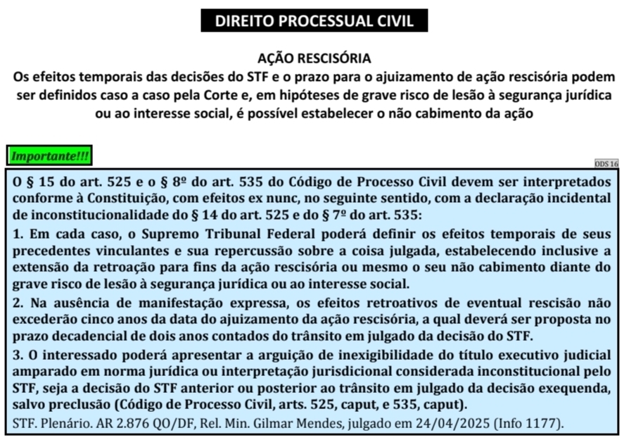 O Supremo Tribunal Federal (STF), ao declarar a inconstitucionalidade de norma posteriormente ao trânsito em julgado da decisão rescindenda, poderá limitar os efeitos temporais de seus precedentes, inclusive para afastar o cabimento da ação rescisória, quando verificar que sua aplicação comprometeria, por exemplo, o interesse social.