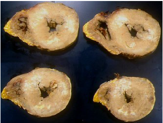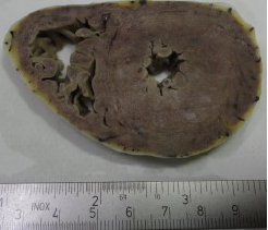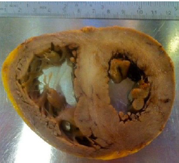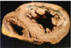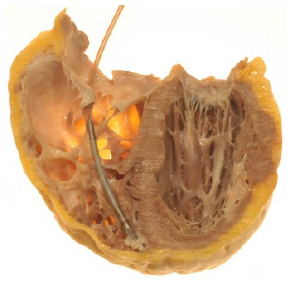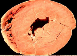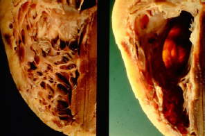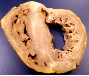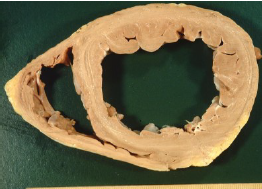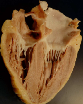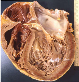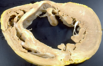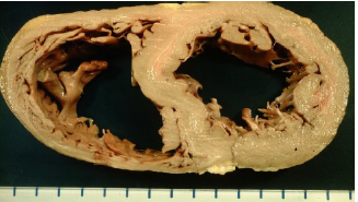 Cardiomiopatia ipertrofica: cicatrici miocardiche estese, setto e assottigliamento della parete libera e marcata dilatazione della camera LV