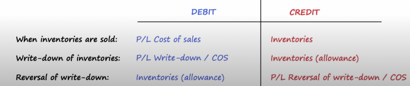 What are the debits and credits for when 1) inventories are sold 2) Write down of inventories ( when NRV< COST) 3) Reversal of write down( when Cost becomes higher than NRV)? Where is right down recorded?