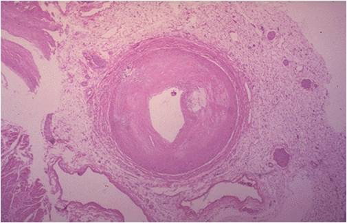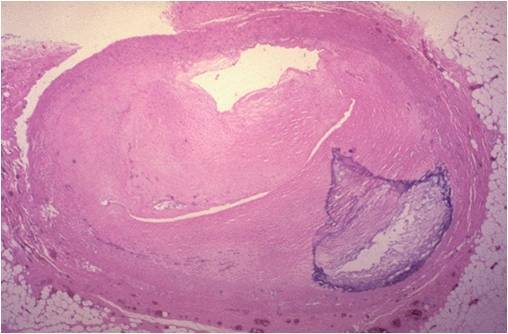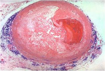 This epicardial coronary artery is almost completely occluded by atherosclerotic plaque. The plaque is heavily lipid laden and has ruptured, releasing thrombogenic substances into the narrow lumen. A thrombus has occluded the tiny lumen that remains.
