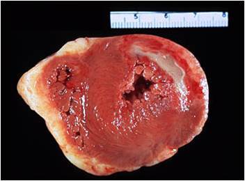 This image shows an acute myocardial infarct in the free wall of the left ventricle, which also has an element of left ventricular hypertrophy. The infarct zone is pale tan, and it is surrounded by a hyperemic area that represents an inflammatory response. The infarct is about 5-7 days old.