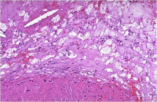 This high magnification of the atheroma shows numerous foam cells and an occasional cholesterol cleft. A few dark blue inflammatory cells are scattered within the atheroma.