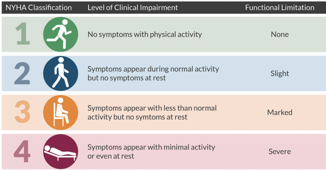 NYHA classification, level of impairment, and functional limitation (4 classes)