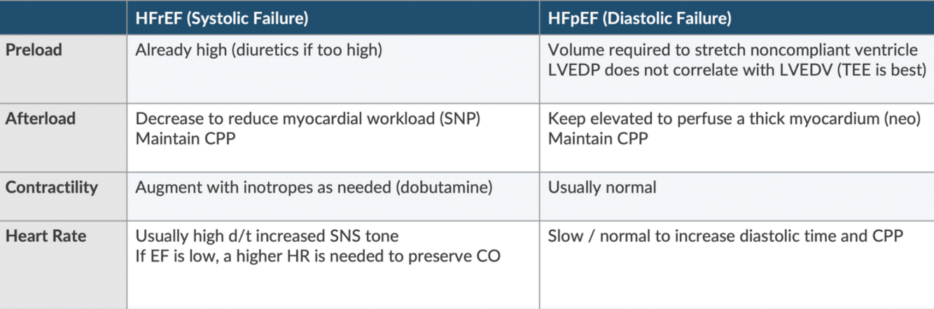 compare anesthetic management of systolic HF and diastolic HF in terms of