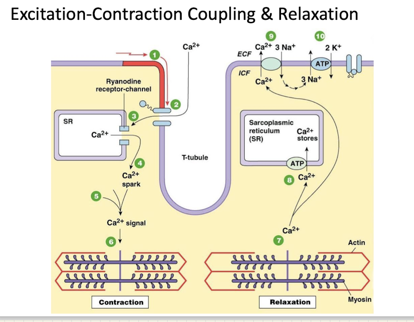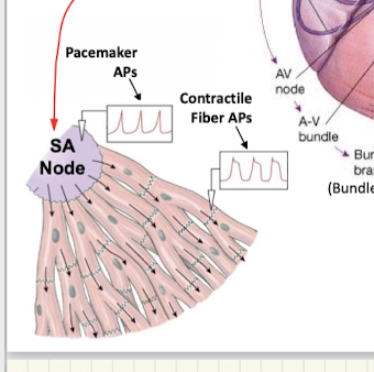 -these ap in the contractual tissues spread from cell to cell to cell - the SA node causes AP to spread to specialized muscle cells which do not contract but conduct APs and the APs spread from muscle cell to muscle cell from the right atrium to the left atrium because there is gap junctions between the right atrial cells and the left atrial cells spreads right across - the AP while doing this is spreading from AP conducting muscle cells which do not contract and just cionvey the AP quicklo a pice of nodal tissue whintimateetween the right atrium and right ventricle atrioventricular node and once the AP gets in the AV node the AP slows down compared to the conducting cells it was in - eventually the AP gets to the far side of the node and spreads to other modified muscles fibers that are elongated like nerve axons but they do not conauteurwhich are called purkinje fibers and they comgenerate AV node and split into two bundles teh right bundlthatthate left bundle and they go down the septum or the partition between two ventricles and convey the AP to the bottom of the heart which is called the apex and there the purkinje fibers split out of the bundle and make gap junctions on the contractual cells and intitate the contractual muscle cells and the contraction of the heart muscle at the bottom of the apex and from there the AP spreads up which is good because that AP is causing the contraction and the contraction is squeexing the blood the arteries through which blood leaves the ventrciels are at the top and the pulmonary arteur and the aorta - all parts of the heart can genearte and AP spontaneously and we saw a little clump of cells taht could do it - the pacemaker tissue the sa node and the av node workls in such a way that generates an AP at the highest frequnecy and with the most regular rhythym - the sa node generates ap at a higher frequency than the av node does so the sa node is the pacemaker for the whole cell because ti generate the AP that spreads through the whilke heart and this also spreads to the av node which triggers contractions - the heart needs to beat in a certain sequnece because it hasj to fill the vsicous blood and eject it