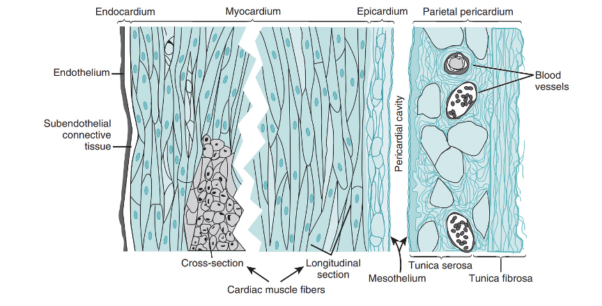 Histology of cardiac muscle: Cardiac tunics and their relationship to the pericardium. The three tunics are homologous to those of blood vessels: endocardium = tunica intima; myocardium = tunica media; and epicardium = tunica adventitia. The pericardium is composed of two layers: the outer parietal pericardium and the epicardium, or visceral pericardium, which is in contact with the heart and roots of the great vessels. The parietal pericardium has two regions: a serosa facing the pericardial cavity and, peripheral to that, a fibrosa.