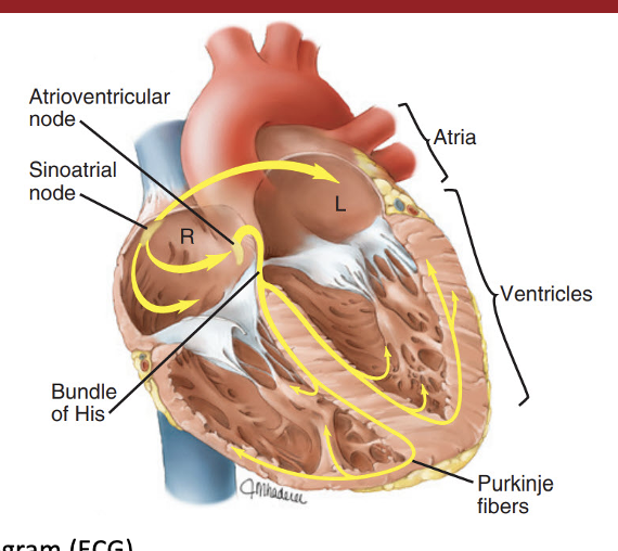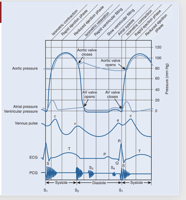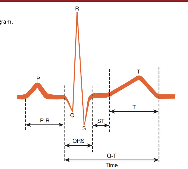 The P wave represents atrial depolarization; the PR interval, atrioventricular conduction time; the QRS, ventricular depolarization; and, the T wave, ventricular repolarization, or recovery. The S1 heart sound co-occurs with the QRS complex and marks the beginning of systole, and the S2 heart sound occurs after the T wave and marks the beginning of diastole.