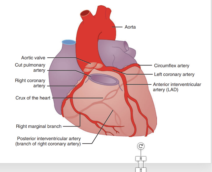 The right coronary artery supplies the sinoatrial node and most often the posterior aspect of the heart; the left coronary artery divides into the left anterior descending and the circumflex arteries