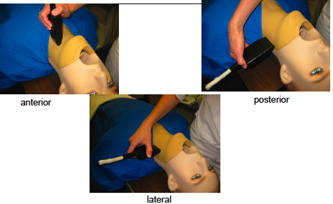 Patient supine, head turned slightly, small pillow only.