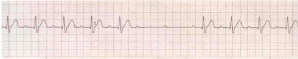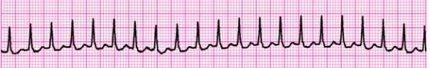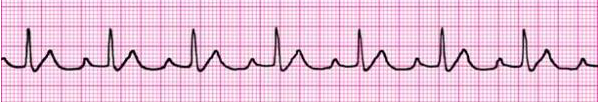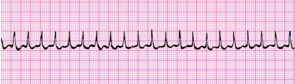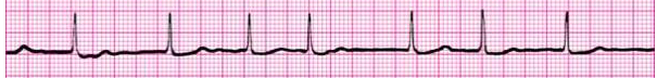 A 36 year-old male presents to ER with palpitations and lightheadedness. He denies chest pain and his blood pressure is 123/72 mmHg. The following rhythm is on the monitor.