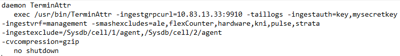 exec /usr/bin/TerminAttr -ingestgrpcurl=10.83.13.33:9910 -taillogs -ingestauth=key,mysecretkey