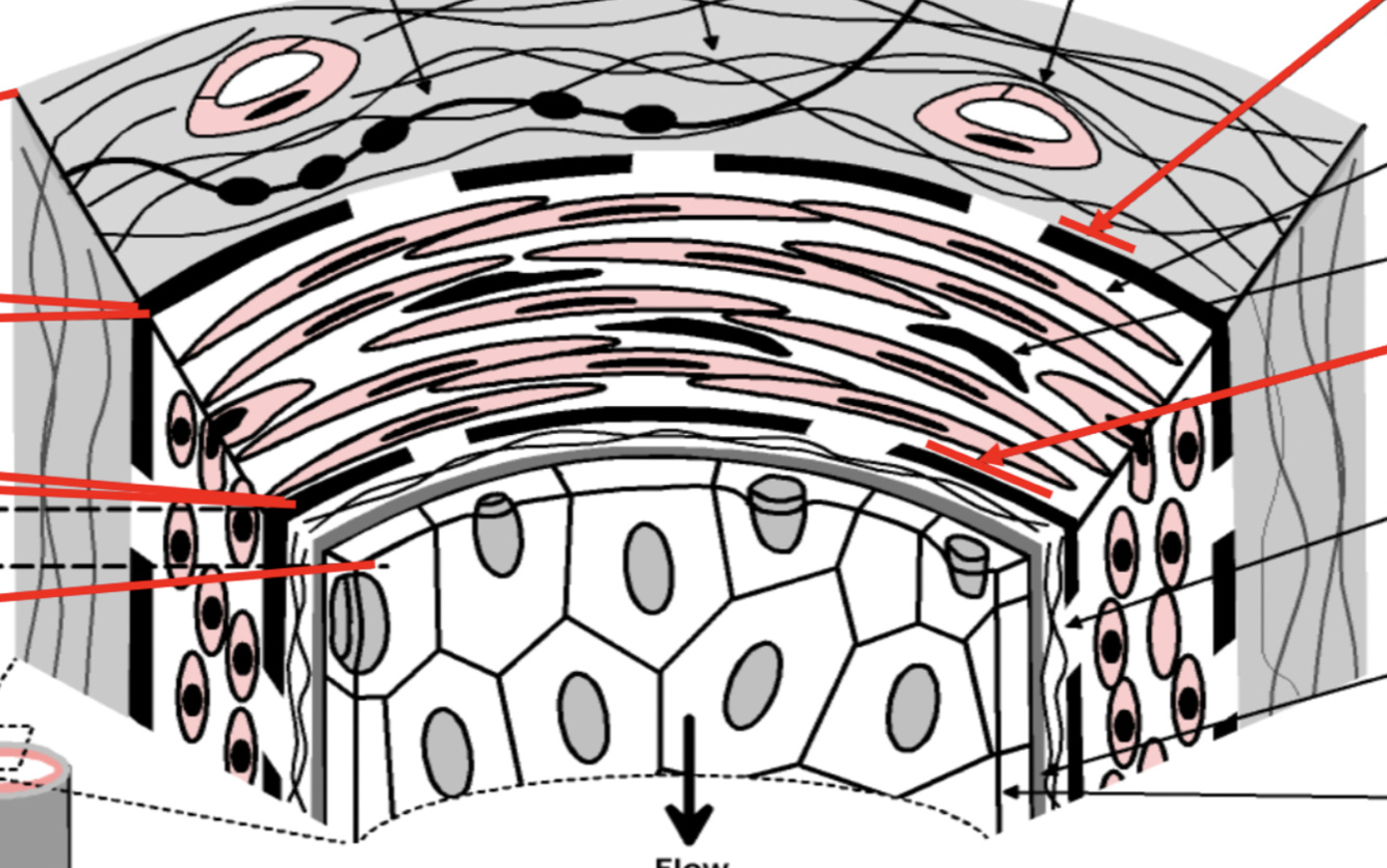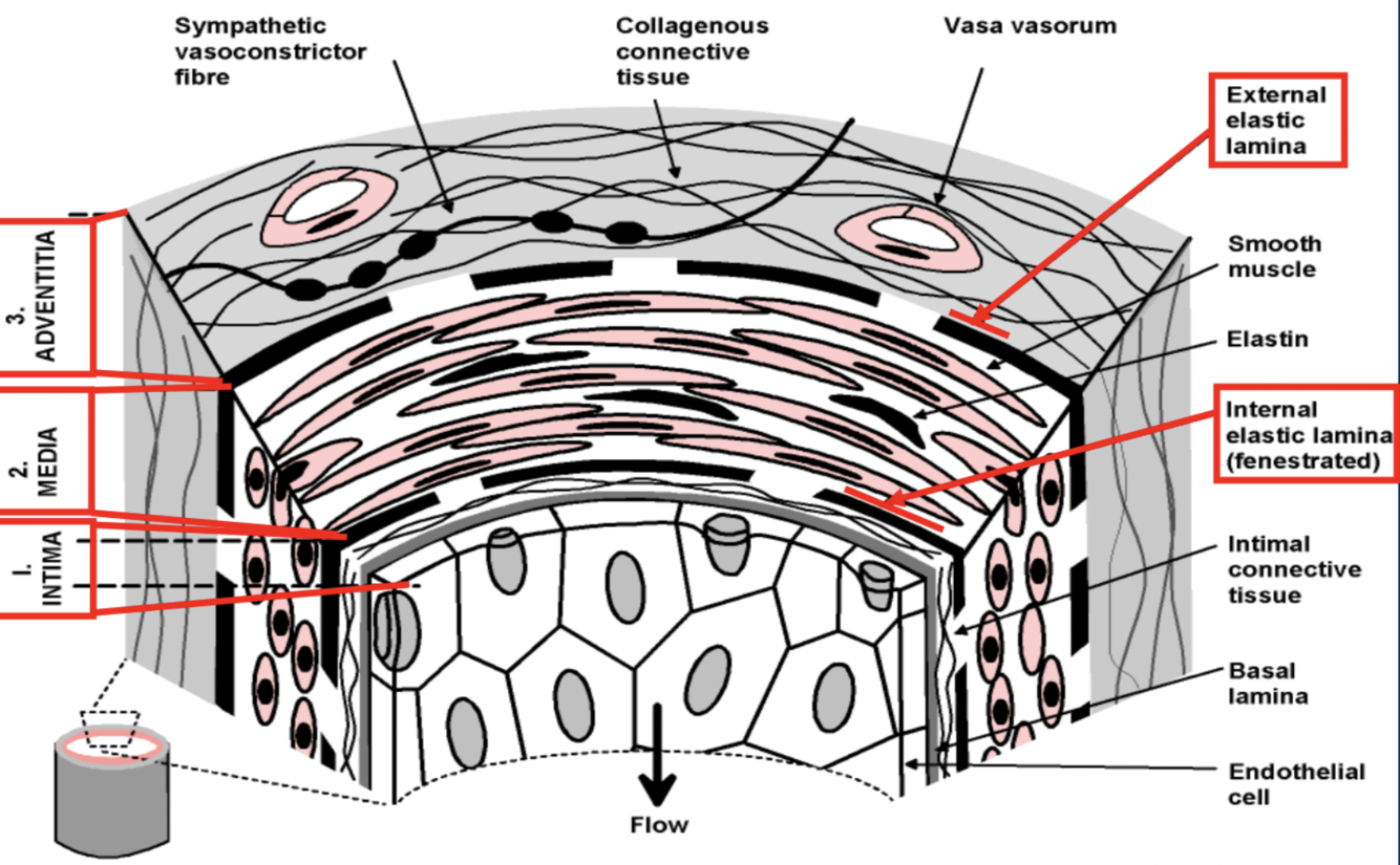 The tunica media layer consists of circular smooth muscle and elastin. They allow elastic recoil and peristalsis of blood thru the vessel