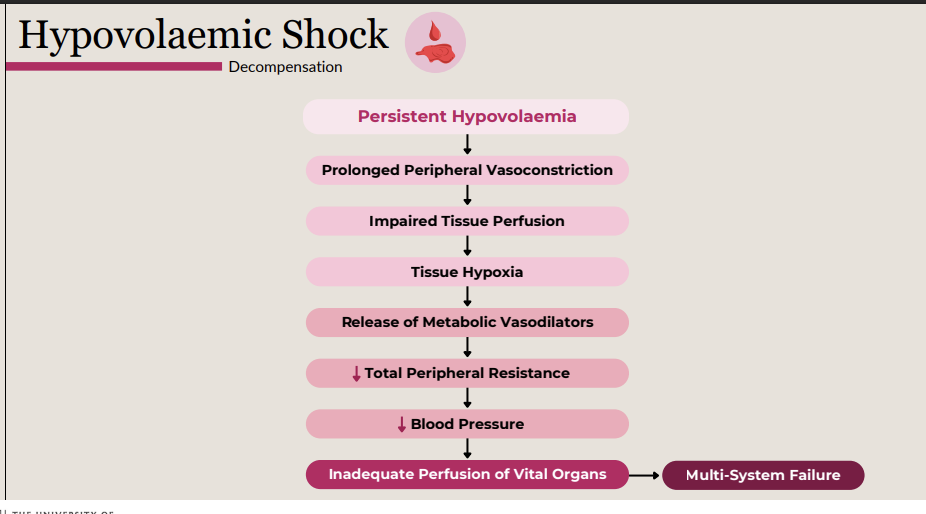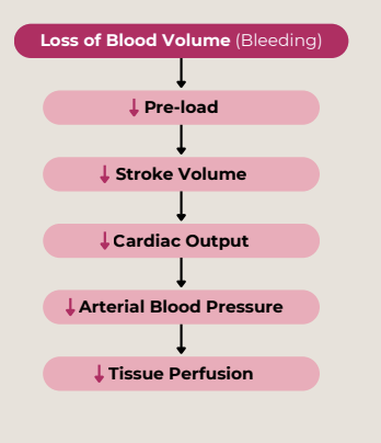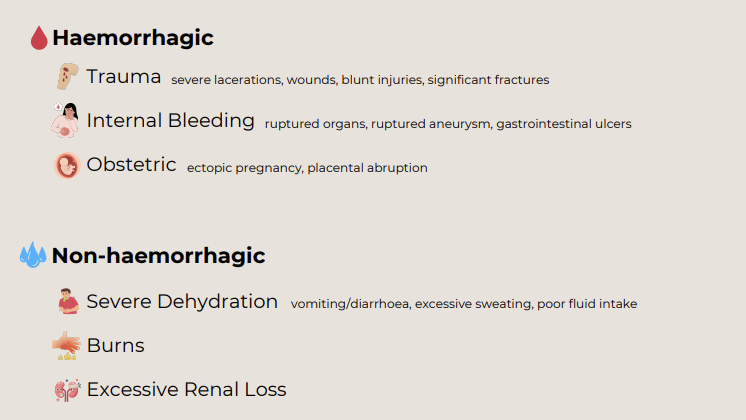 a loss of blood or fluid volume e.g haemorrhages, burns, dehydration - leading to decreased mean arterial pressure and poor tissue perfusion