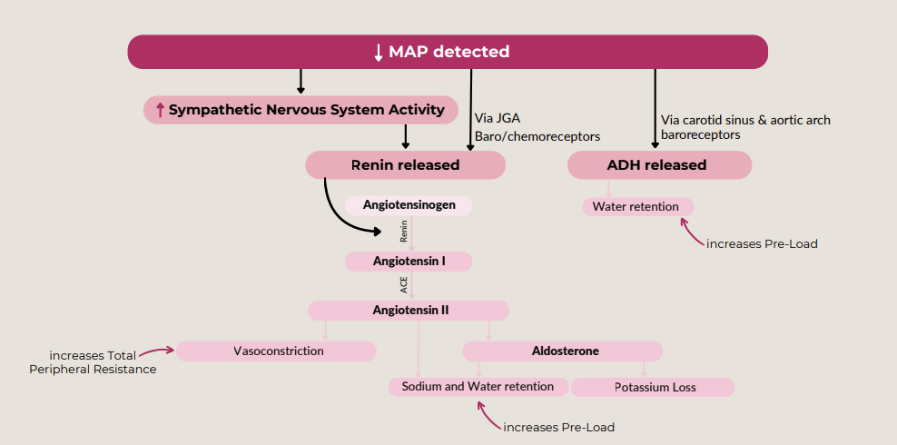 sodium and water retention: ALDOSTERONE from RAAS = increase PRE-LOAD