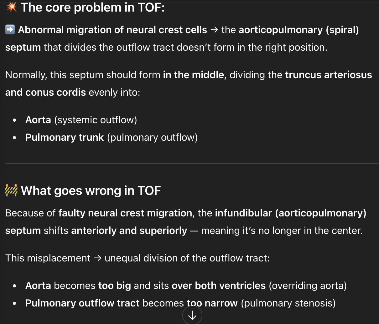 failed migration of neural crest cells contributes to the anterior and superior displacement of the infundibular septum - septum is malpositioned