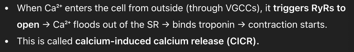 influx of Ca2+ through VGCCs triggers RyRs to open -> Ca2+ floods out of the SR -> binds troponin -> contraction starts