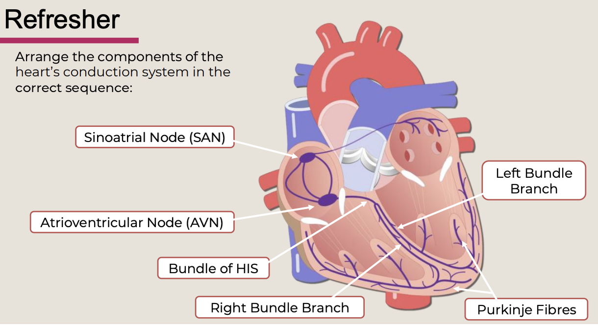 atrial depolarisation -> AV node -> His-Purkinje -> ventricles
