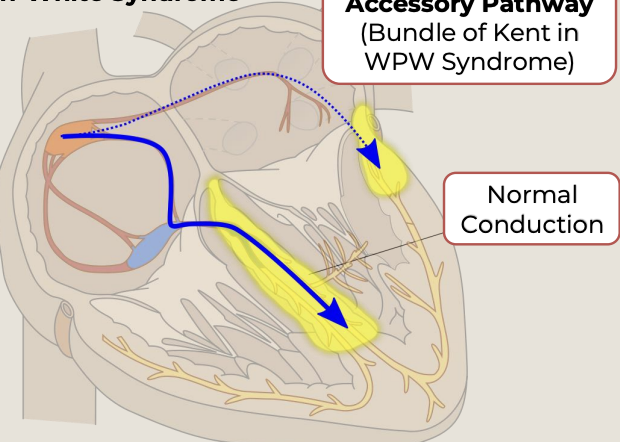 accessory pathway - Bundle of Kent that connects atria to the ventricles - bypass normal AV node delay