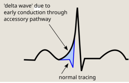 ‘delta wave’ due to early conduction through accessory pathway = represents slow initial ventricular depolarisation