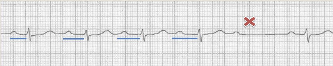 - PR interval gets progressively longer with each beat until one P wave is not followed by QRS complex