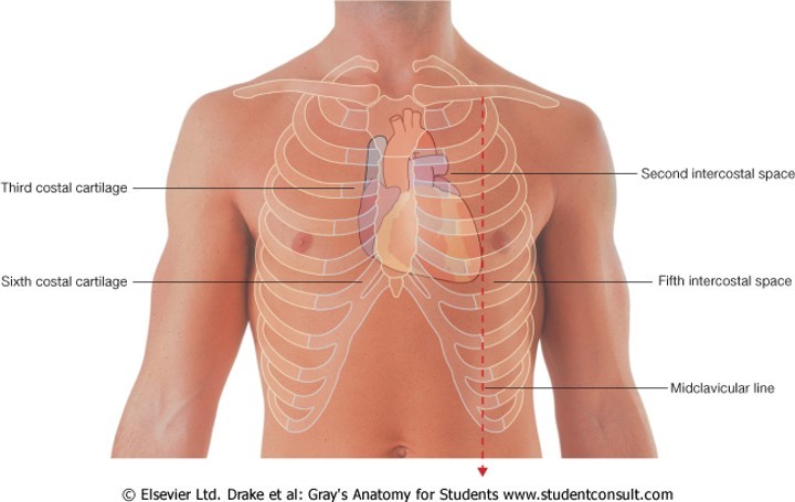 5th ICS MCL to the 2nd left ICS 2.5 cm from the sternal border
