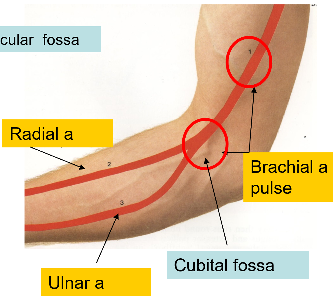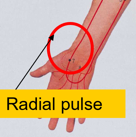 Press index and middle fingers lateral to the flexor carpi radialis tendon
