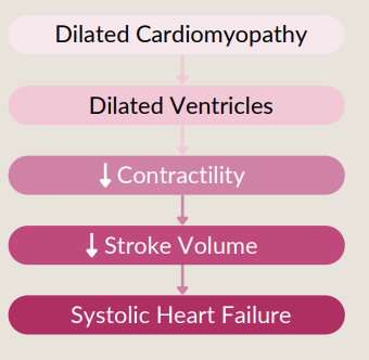 ventricles become dilated and walls become thin/floppy = overstretched fibres cant contract effectively -> reduced contractility -> reduced SV