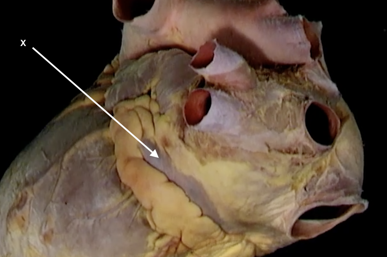 underside of the right atrium (just below opening for IVC)