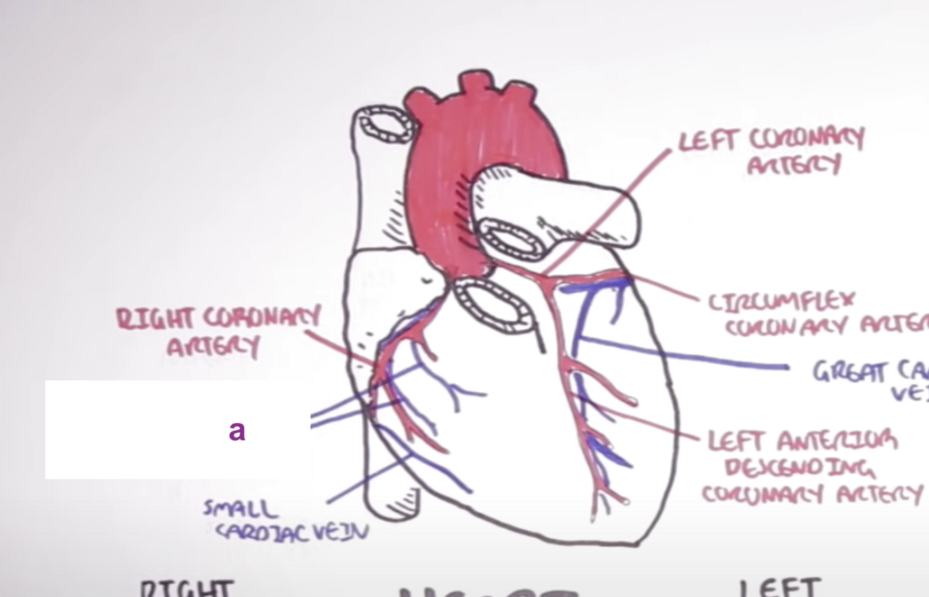 c. right coronary artery - runs in right atrioventricular groove, along the back of heart and terminates at the right interventricular artery