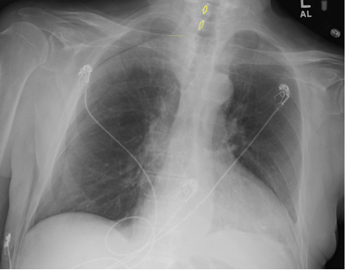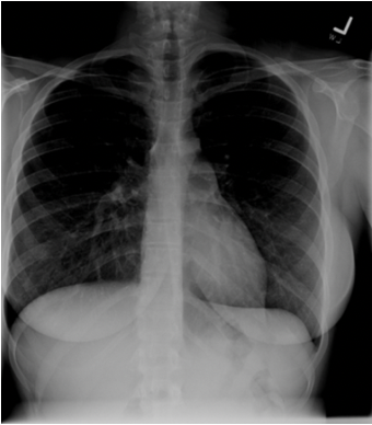 In this CXR, which way is the patient rotated?