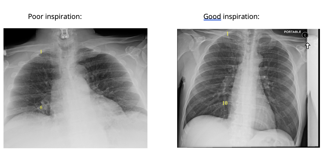 Deeper inspirations show more lung and result in better overall images with less haziness at the lung bases and less enlargement of the heart and mediastinum.