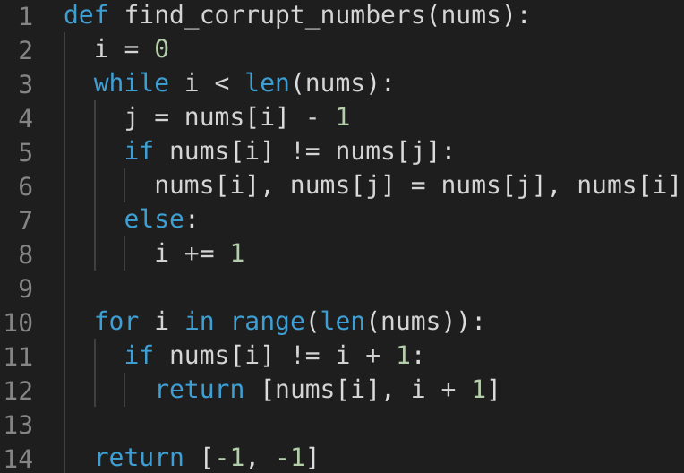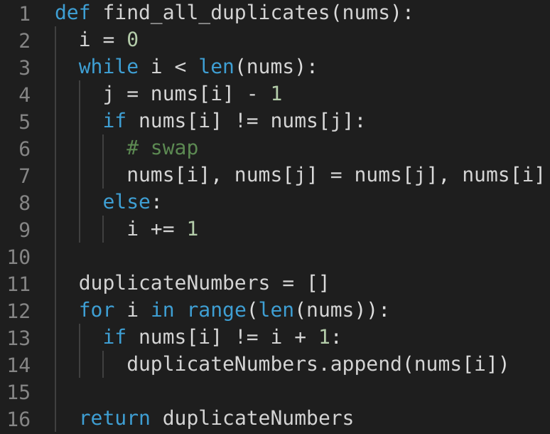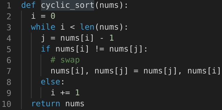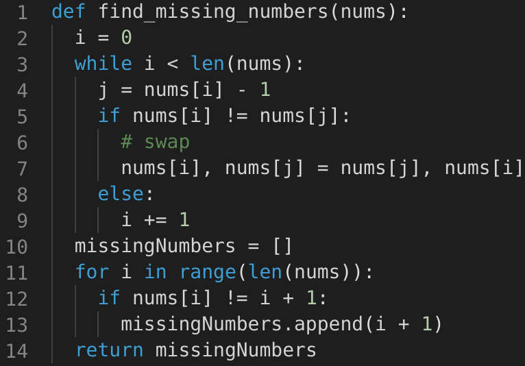 • In this problem, each number should be equal to its index, compared to index + 1 in the Cyclic Sort. Therefore => nums[i] == nums[nums[i]