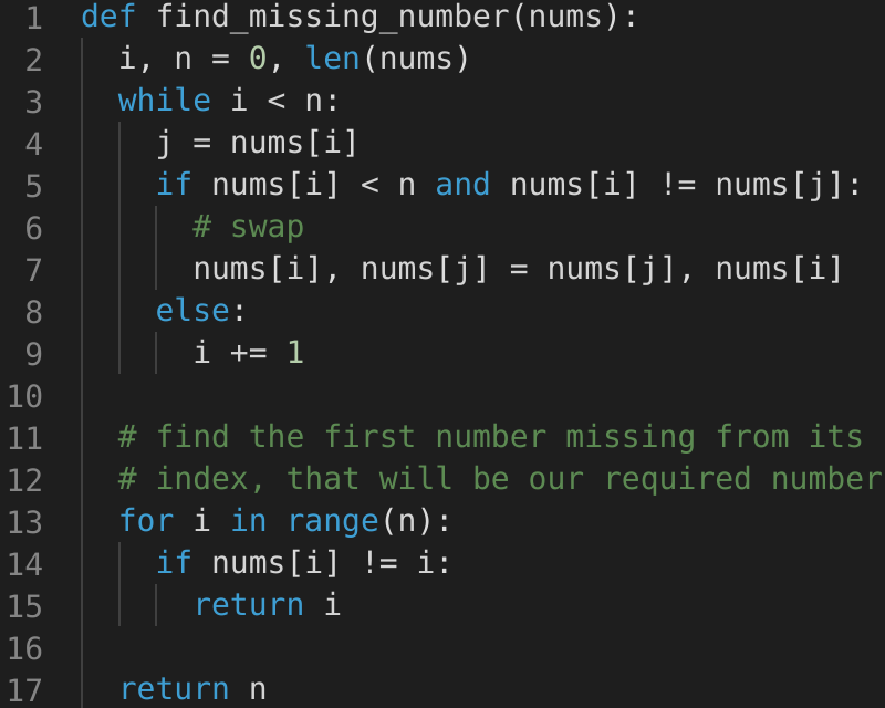 This problem follows the Cyclic Sort pattern and shares similarities with Find the Missing Number with one big difference. In this problem, the numbers are not bound by any range so we can have any number in the input array.