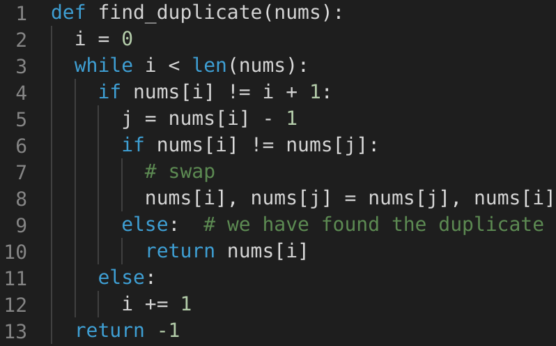 This problem follows the Cyclic Sort pattern and shares similarities with Find the Missing Number. Following a similar approach, we will try to place each number on its correct index. Since there is only one duplicate, if while swapping the number with its index both the numbers being swapped are same, we have found our duplicate!