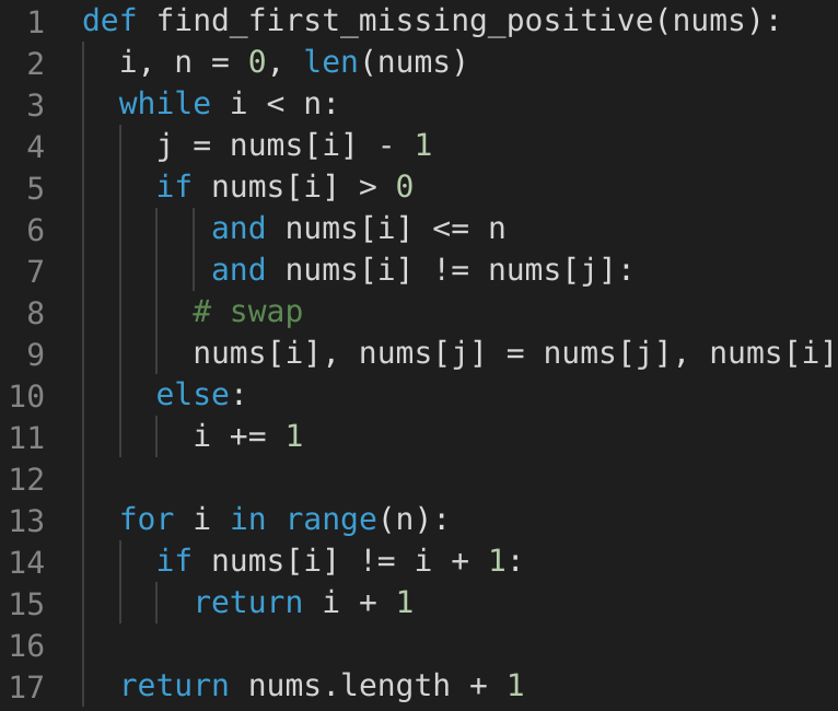 However, we will follow a similar approach though as discussed in Find the Missing Number to place the numbers on their correct indices and ignore all numbers that are out of the range of the array (i.e., all negative numbers and all numbers greater than or equal to the length of the array). Once we are done with the cyclic sort we will iterate the array and the first index that does not have the correct number will be the smallest missing positive number!
