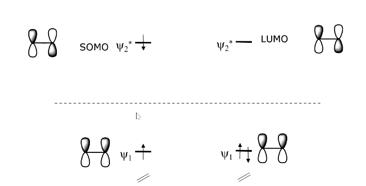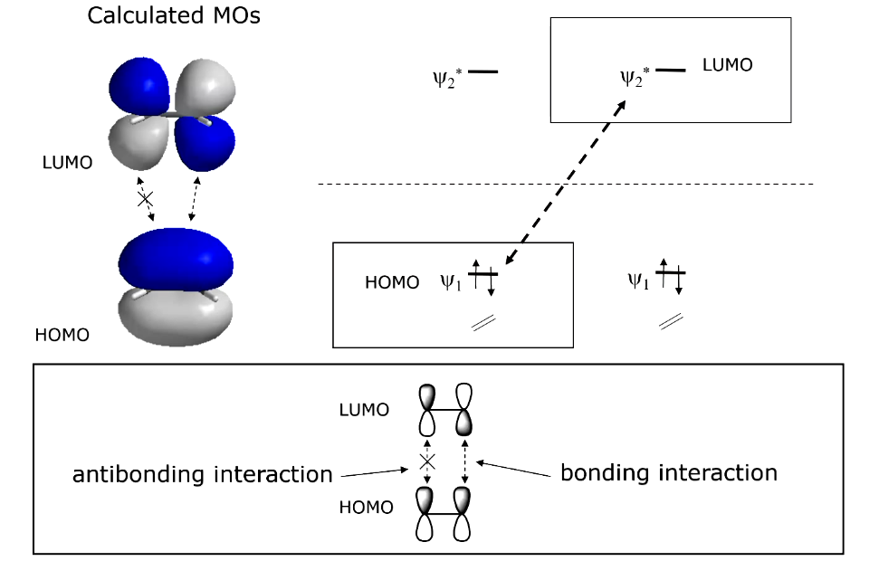 Overlap between the HOMO and LUMO does not lead to productive overlap due to being out of phase - impossible to twist bonds to cause overlap - geometrically impossible