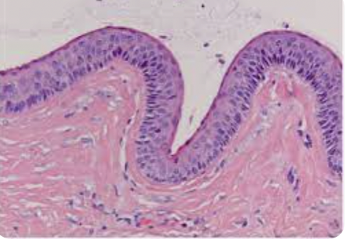 - Stratified squamous epithelium lining which may be incomplete and show areas of ulceration or hyperplasia