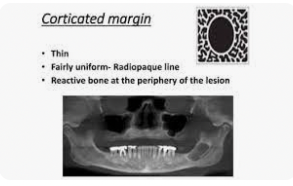 - Well differentiated corticated margin (which is continous with the lamina dura on either side of the root)