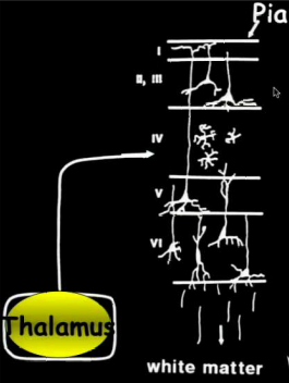 1) Ascending axons 2) Sensory from other cortical layers 3) Output to other cortical layers across corpus callosum 4) Sensory stellate cells that receive thalamic input 5) Output to brainstem and spinal cord 6) Output to thalamus