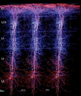 Cortical columns. The cells within each column are very tightly linked with one another and have roughly the same function.