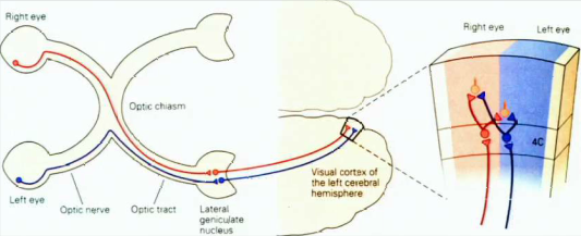 Ocular dominance columns in the visual cortex. Each eye activates one cortical column.