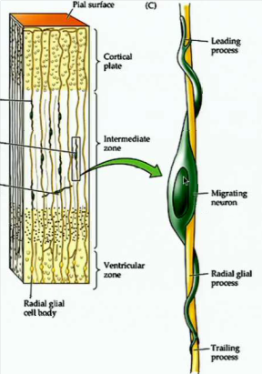 They migrate along the radial glial cells. Note that once they are finished as a “scaffold” they become astrocytes.