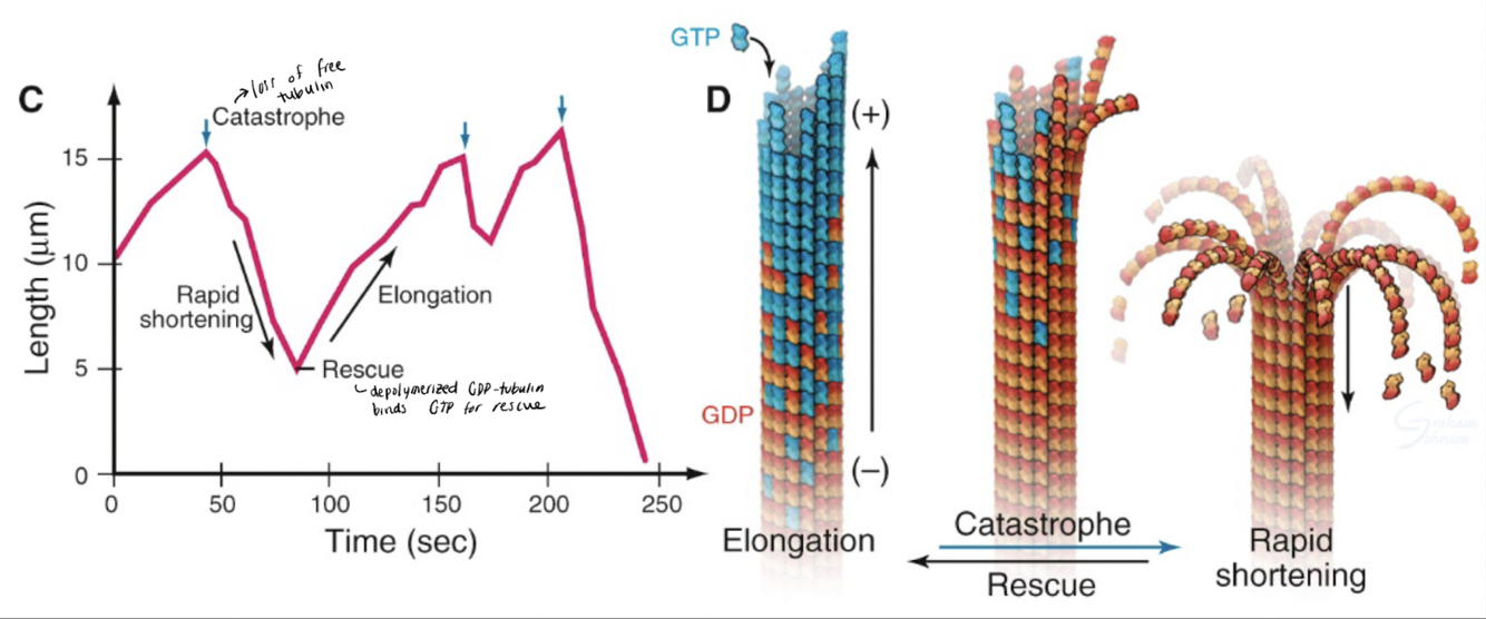 Microtubules go through phases of elongation that exhaust available tubulin dimers and results in depolymerization of the tubule from the - end. The newly released GDP-tubulin dimers from the - end bind new GTP and repolymerize.
