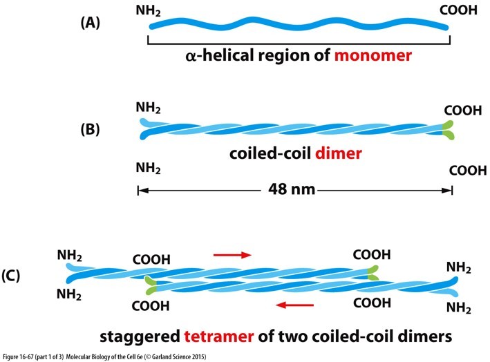 Two coiled-coil dimers form a tetramer by lining up (c-terminus next to c-terminus, staggered)