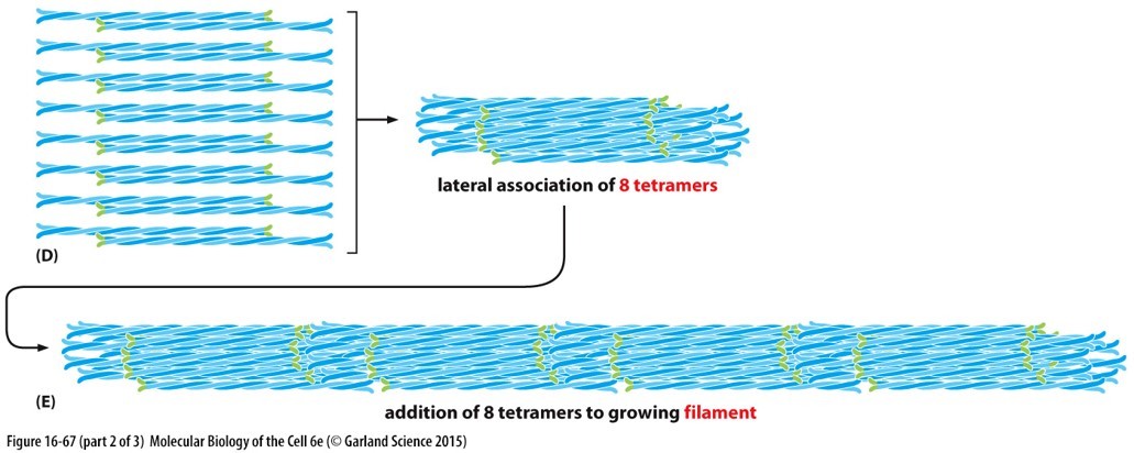 8 tetramers line up in parallel. 32 individual a-helical coilds per filament.