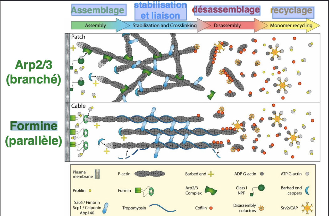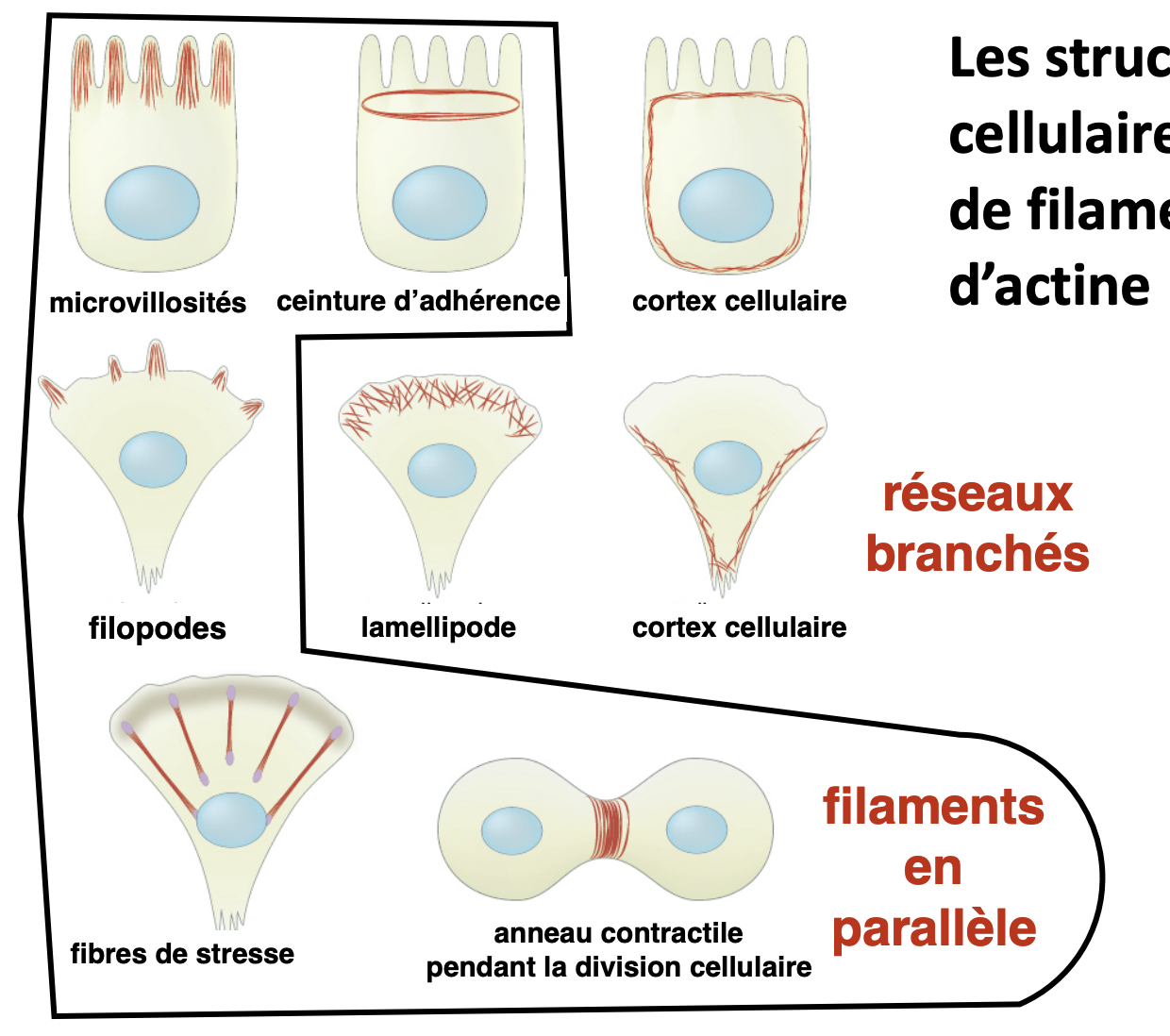 Filaments parallèles (microvillosités, ceinture d’adhérence, filipodes, fibres de stress, anneau contractile) ou orientation en réseau branché (cortex cellulaire, lamelipodes)
