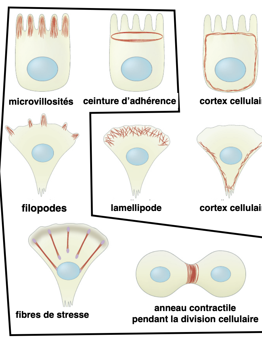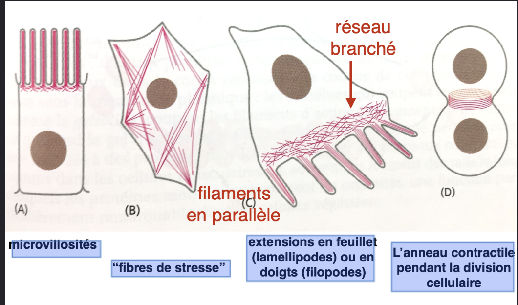 Microvillosités, fibres de stress, extensions en feuillets (lamellipodes) ou en doigts (filipodes), l’anneau contractile durant la division cellulaire pour diviser physiquement la cellule en 2